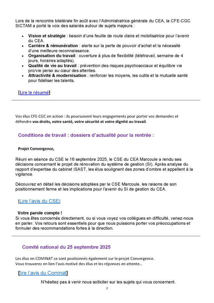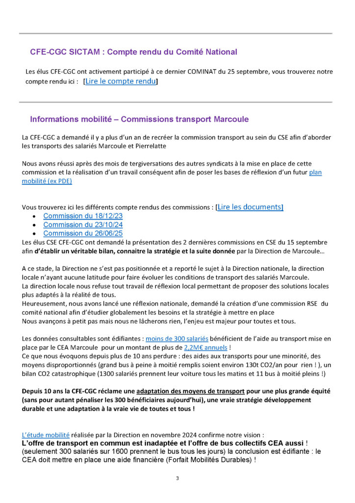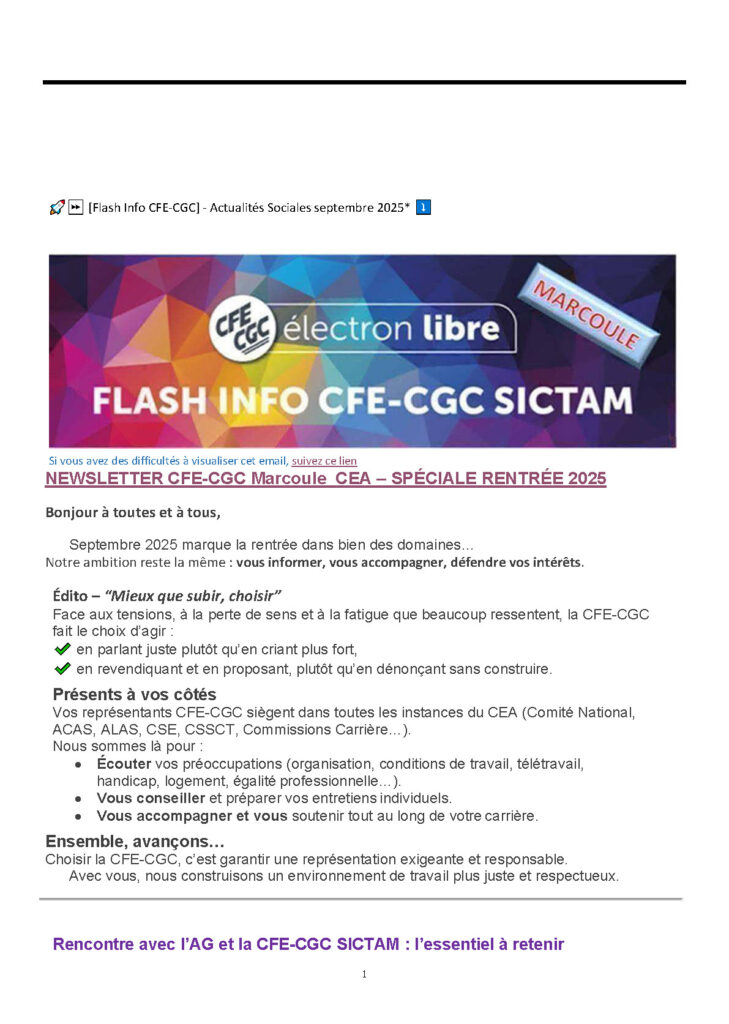 Flash info Marcoule : Septembre 2025 – Rencontre AG, Transports , Cominat Auteur/autrice de la publication :marcoule Publication publiée :27 octobre 2025 Post category:Actualités Electron libre / Actualités par date / Infos CSE Étiquettes: Flash infos Read more articles Article précédentFlash info Marcoule : après les chèques vacances… Un panier garni pour Noël … MERCI QUI ? Article suivantFlash info Marcoule : Octobre 2025 – Loi n° 2025‑989 du 24 octobre 2025 portant transposition des accords nationaux interprofessionnels en faveur de l’emploi des salariés expérimentés et relative à l’évolution du dialogue social Vous devriez également aimer Actualités COVID-19 du 20 au 24 avril 2020 24 avril 2020 Actualités COVID-19 du 18 au 20 mai 2020 23 mai 2020 Les dernières info Novembre 2023 6 novembre 2023